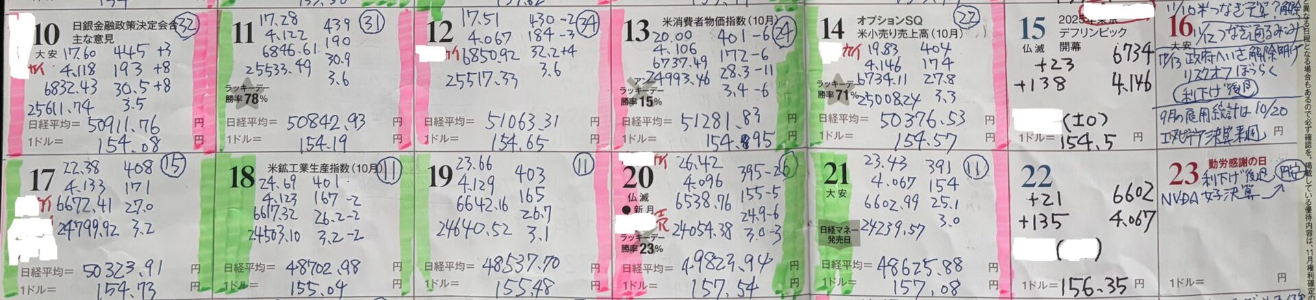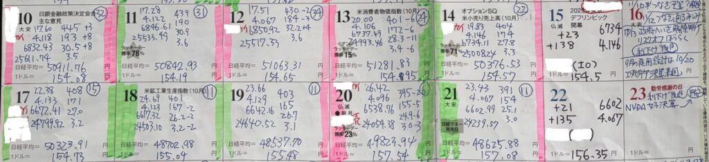 最後に、1日のマスの左側縦枠線を日経平均、マスの右側縦枠線をSP500と見立てて、前日比で上げたら、蛍光ペンのピンク色で塗り、下げたら緑色で塗っています。暴騰・暴落は太めの線で(笑)。こうするとパット見、日米相場が色で上げ下げがわかります。